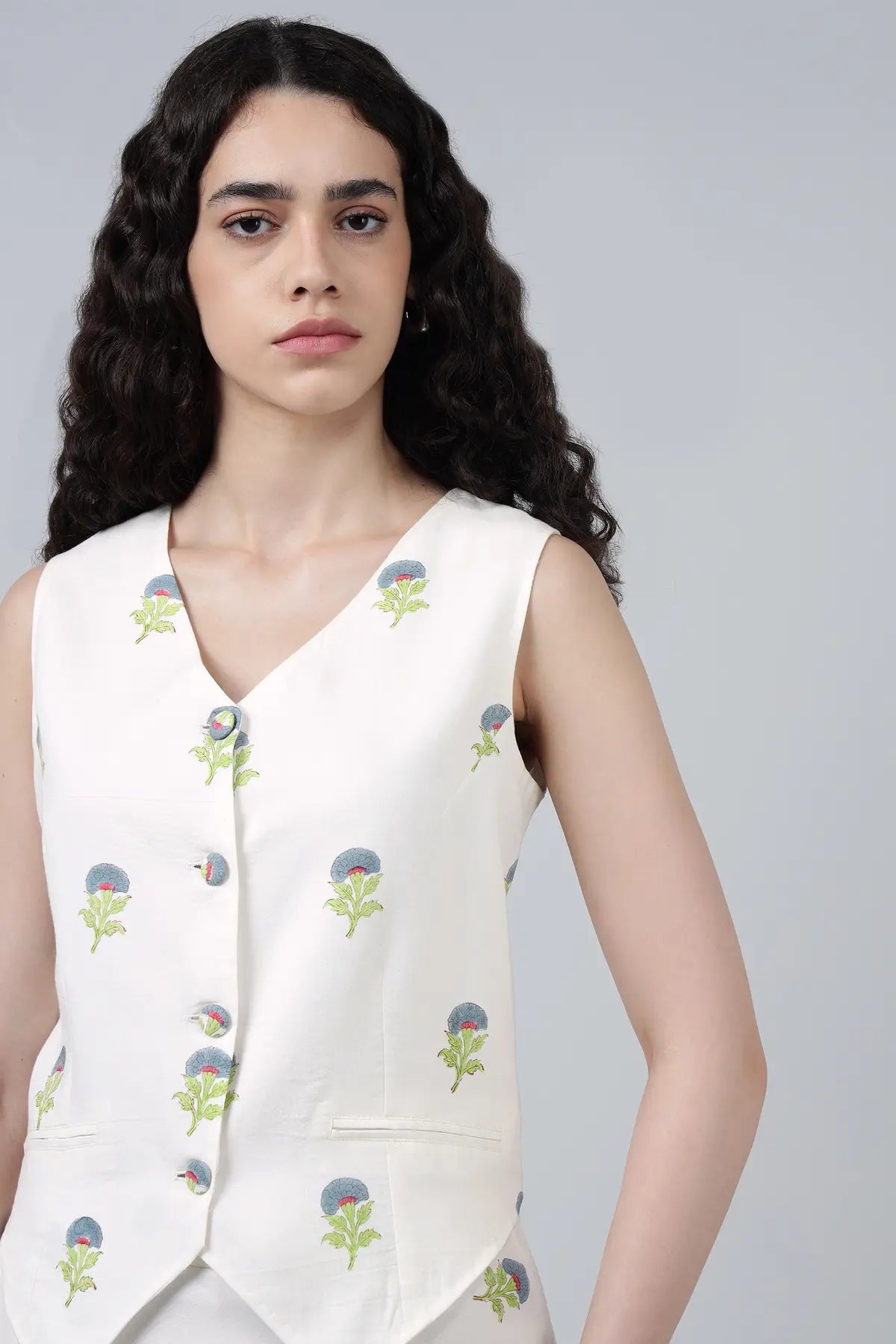 The sharp V-neck waistcoat is tailored with light fusing, fabric-covered buttons, and mul lining for comfort—finished with French seams for a clean feel.