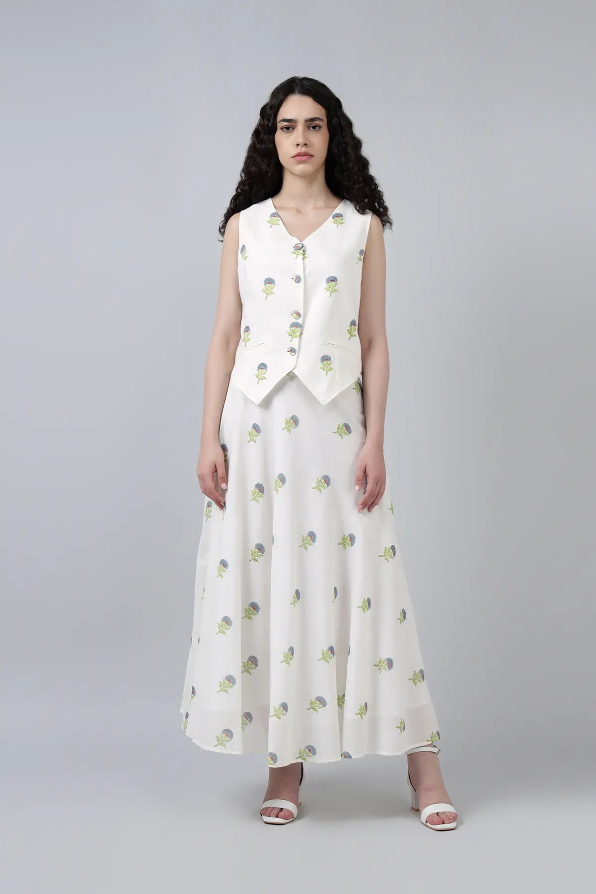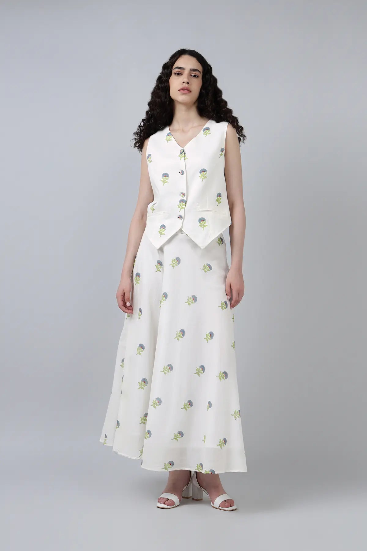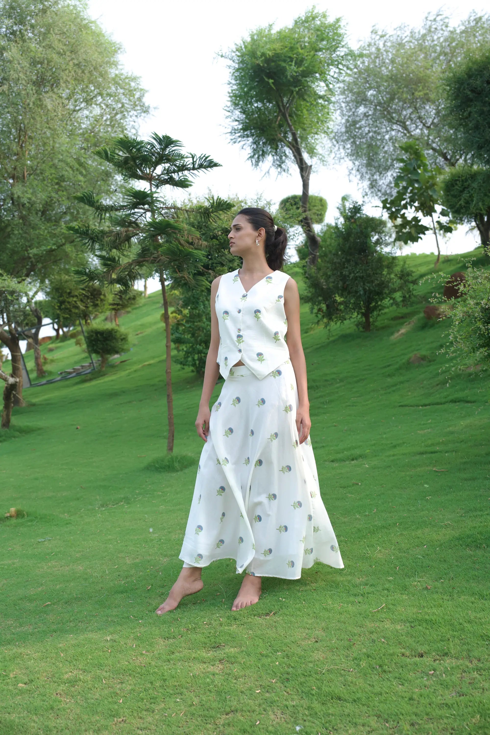 Paired with a flowing A-line skirt featuring a clean-faced waistband, concealed side zip, and a side pocket for ease. Fully mul-lined for softness and coverage