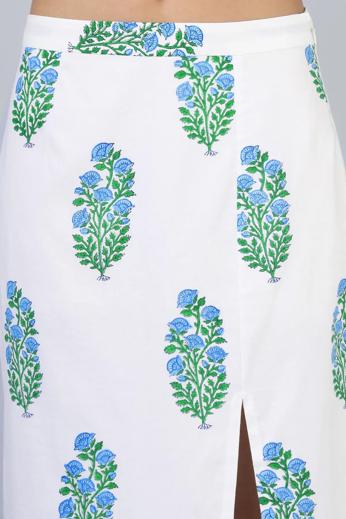A tailored pencil skirt that contours gracefully, featuring a front slit for ease of movement. Finished with a clean waistband, concealed side zip, and fully lined with soft mul for comfort. Pair it with our matching bandeau top for a chic co-ord look or style it with a classic shirt for effortless elegance.\n\nSubtle dye and print variations are a natural part of the charm and authenticity of hand block printing.\n\n \n\n \n\n \n\n \n\n