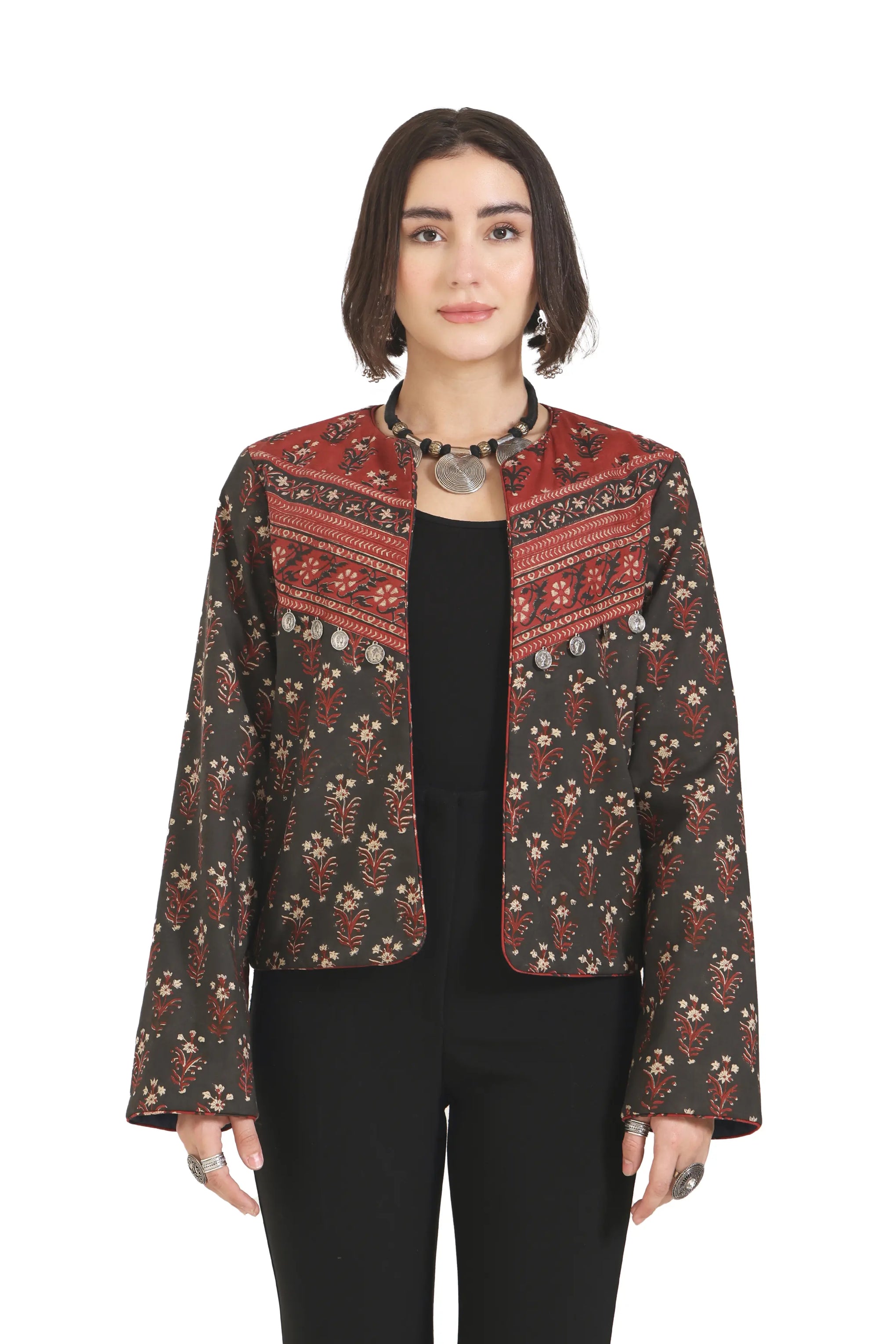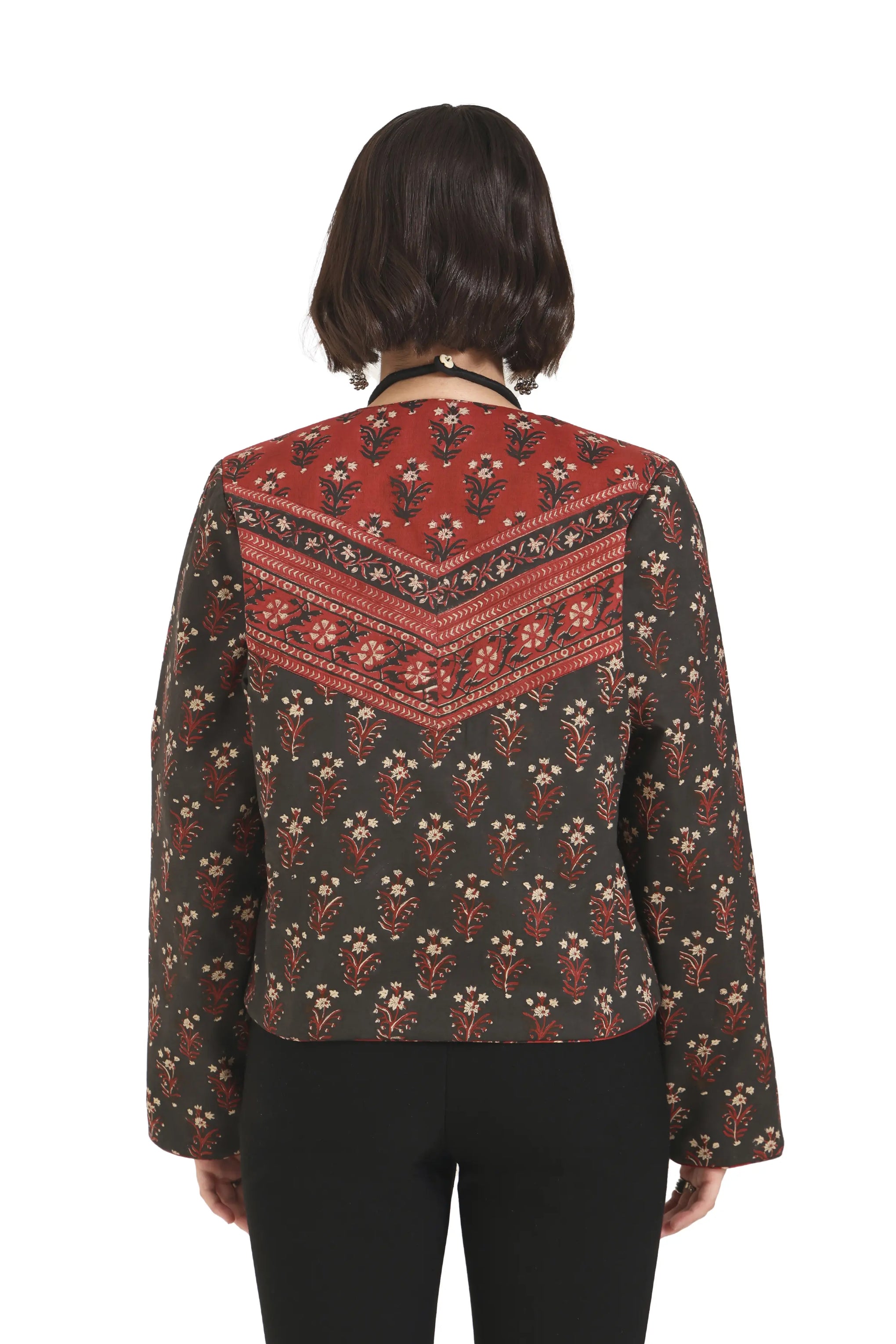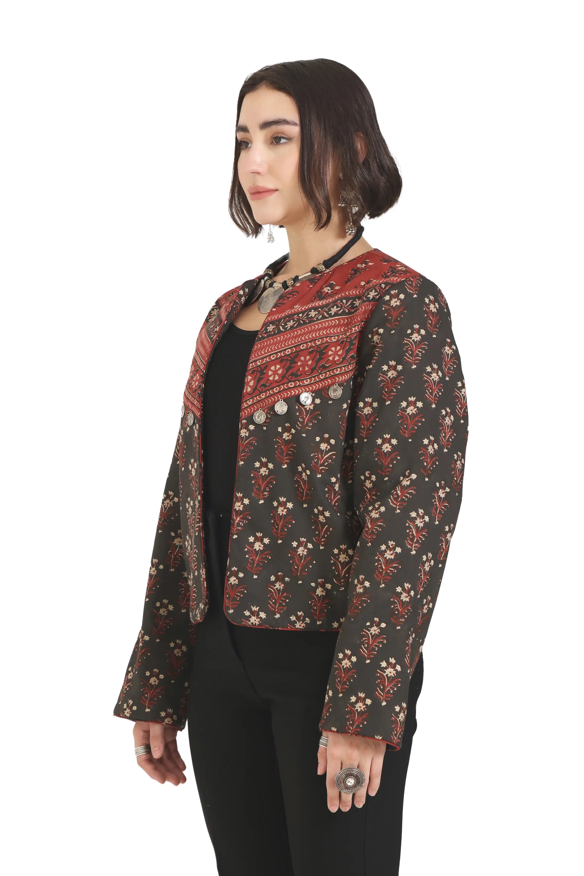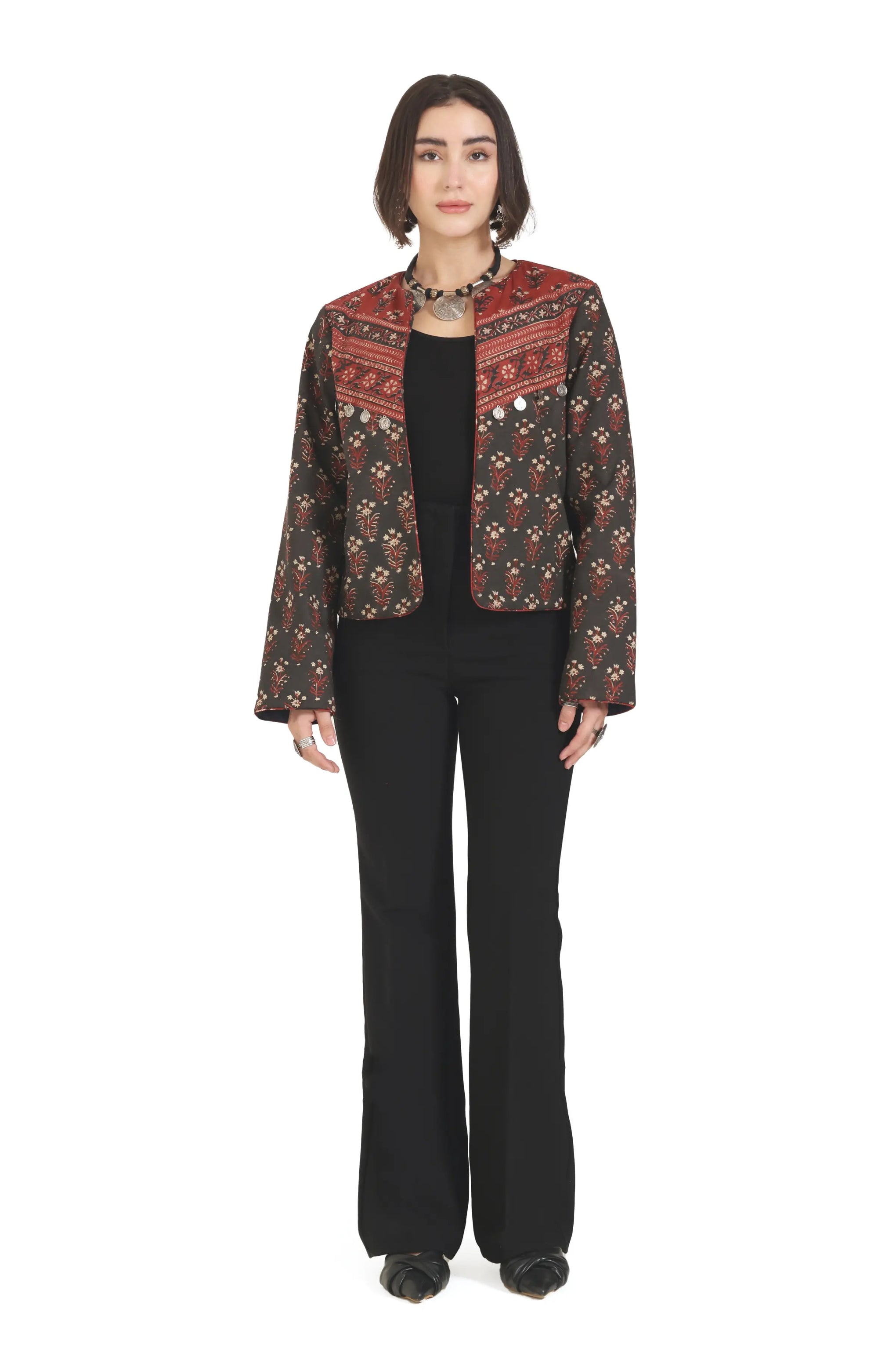 This hand block–printed jacket is thoughtfully layered with felt on the inside, offering gentle warmth for cooler days. Designed in a clean, cropped silhouette, it balances structure with ease. Contrast border detailing at the front and back, adding depth and definition. Delicate coin chain accents across the front lend a subtle bohemian character without excess.Lightweight yet insulating, it transitions effortlessly from winter days to early spring evenings. A refined statement layer that pairs heritage craft with modern styling.