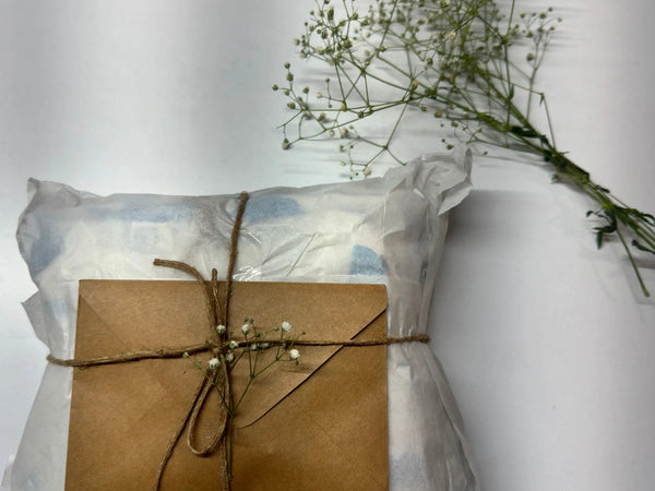 Rejecting plastics entirely, we deliver your order in a "second life"—using inner envelopes reborn from recycled Blinkit bags or pattern scraps and outer envelopes handmade in-house by Pratima Ji. Tied with handmade paper tags and raw ropes, our packaging remains a resourceful extension of the craft.