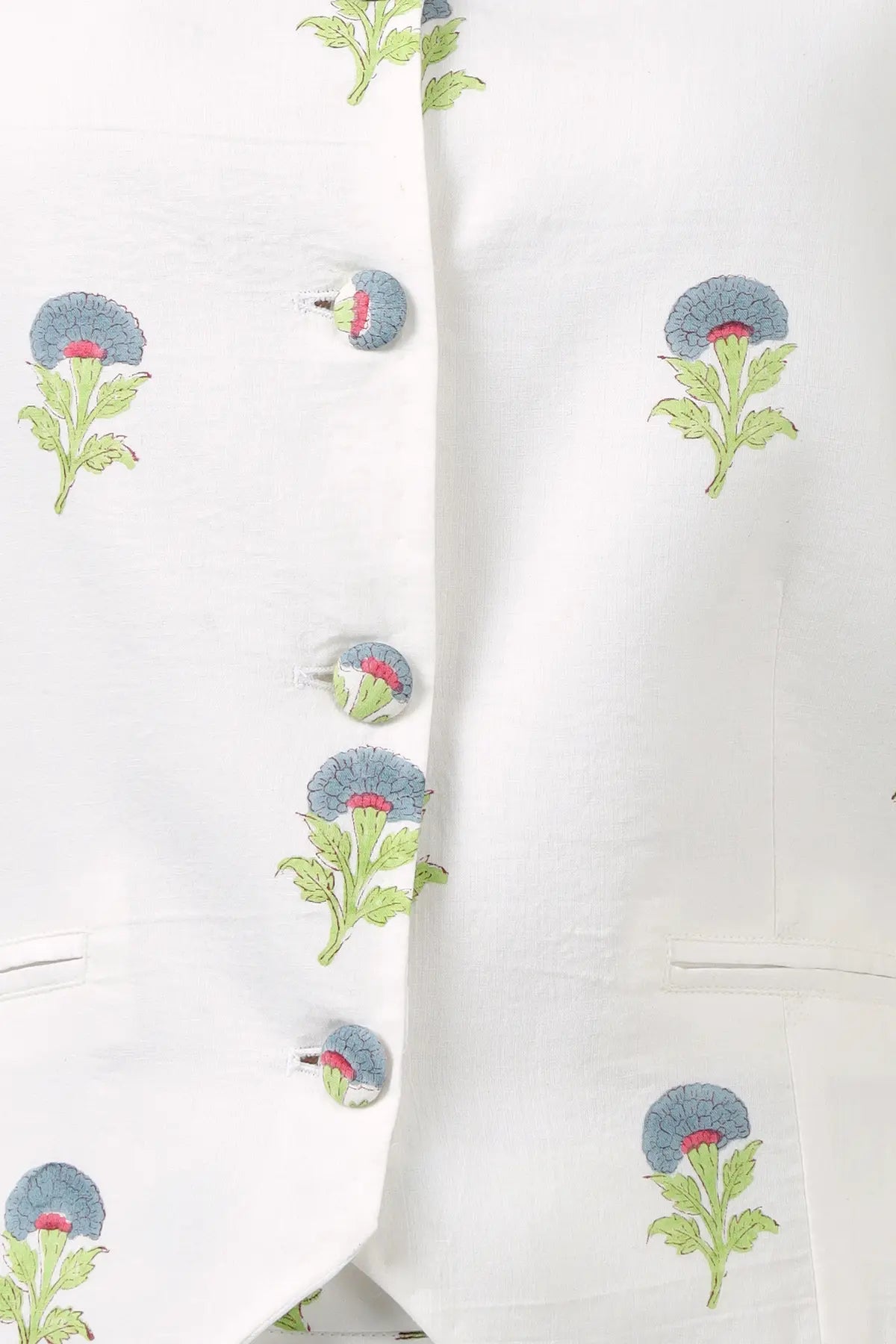 A structured yet soft waistcoat featuring a sharp V-neckline, fabric-covered buttons, and light fusing for shape. Lined with mul for comfort, finished with French seams for a clean, durable construction  Style it with pants or a skirt for a polished look \n \nSubtle dye and print variations are a natural part of the charm and authenticity of hand block printing.